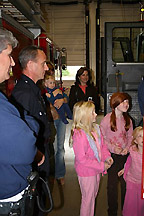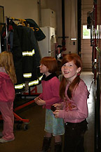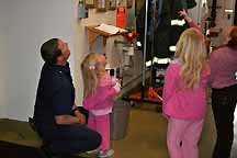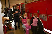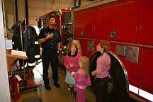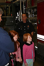 | After the talk Dan took the children on a tour of the fire trucks. He let them sit in the front, and explained that it has many of the same things your family car has. It also has different panels that control the lights, sirens, pumps, radios, & ladder. |