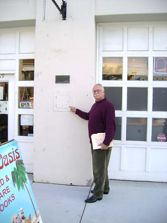 Lynn is pointing at the Emergency Fire Alarm Button. There had been a door that anyone on the street had access to, and a large red button behind, that when pushed would set off the alarm.