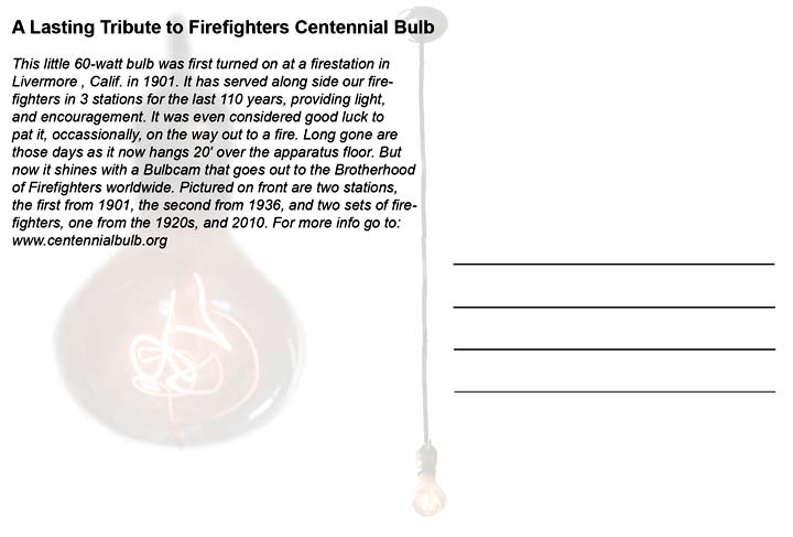 All of the cards are 4x6". To get your postcard send a self addressed stamped envelope to: Centennial Bulb Webmaster19257 Rollinghills CrtCastro Valley, CA 94546 centennialbulb@hotmail.com